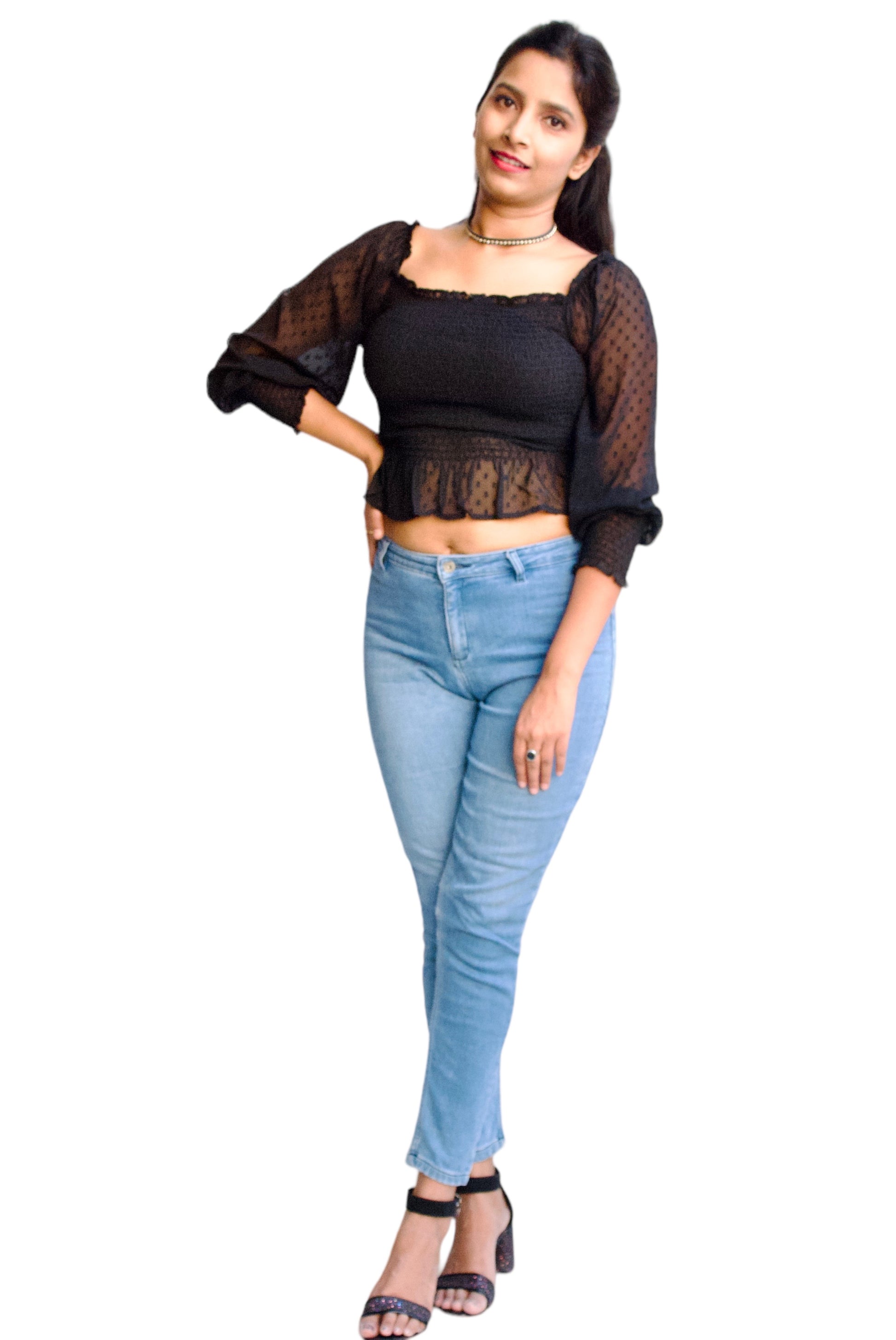 *Women Black Color Smocked Fabric Fitted Crop Top.